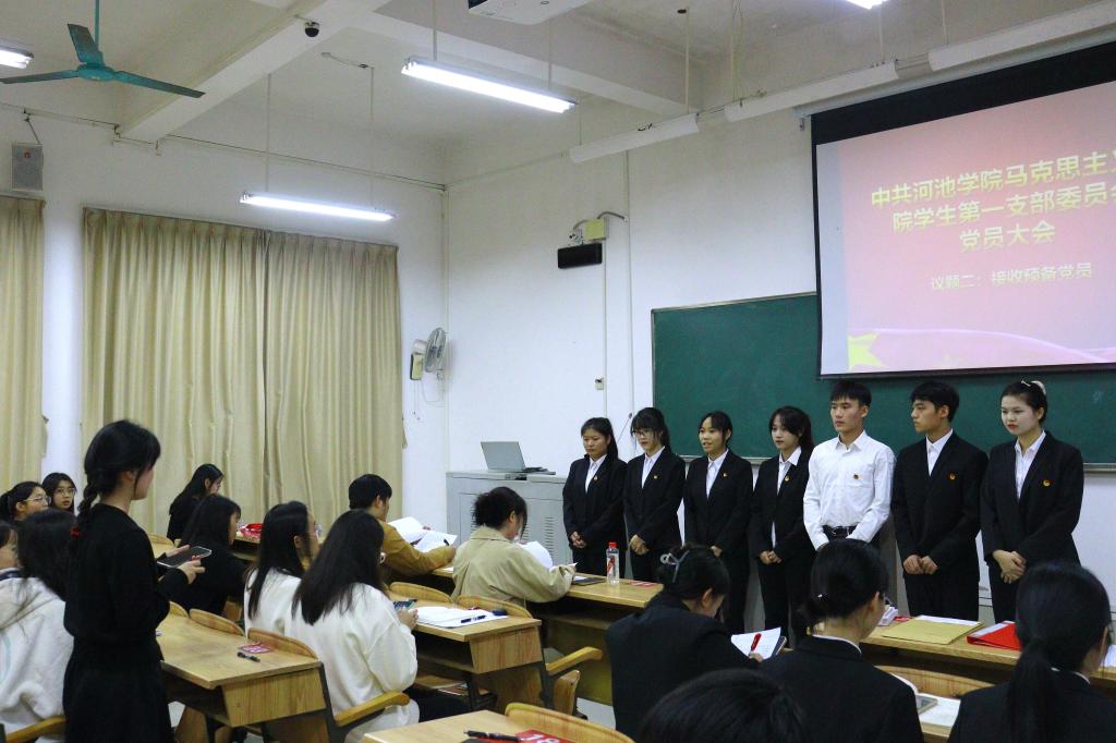 会上,各党支部书记首先介绍了会议的筹备过程及传达了《中国共产党章程》《中国共产党发展党员工作细则》《william威廉英国官网发展党员答辩制实施办法(试行)》的相关要求。随后,一支部7名发展对象、二支部8名发展对象、三支部7名发展对象分别在本支部的支部大会上就对党的认识、入党动机、本人履历、家庭和主要社会关系以及需向党组织说明的有关问题逐一进行汇报。答辩小组成员根据发展对象的汇报情况就党的基本理论、入党动机、习近平新时代中国特色社会主义思想、党的二十大报告精神等相关知识进行提问,发展对象结合自身实际都能较好地回答答辩小组成员提出的问题,得到答辩小组的充分肯定。接着,各支部大会针对本支部预接收的同志的情况进行逐个讨论、审议发展对象接收为预备党员的问题。经支部大会的充分讨论与全体正式党员的无记名投票,各个支部都一致同意接收22名同志为中共预备党员。在表态环节中,22名同志纷纷表示在今后的学习、工作、生活中会不断提高思想认识和政治理论水平,进一步坚定理想信念,牢记青春使命,勤奋刻苦学习,团结同学,积极参加各项活动,做一名合格的共产党员。