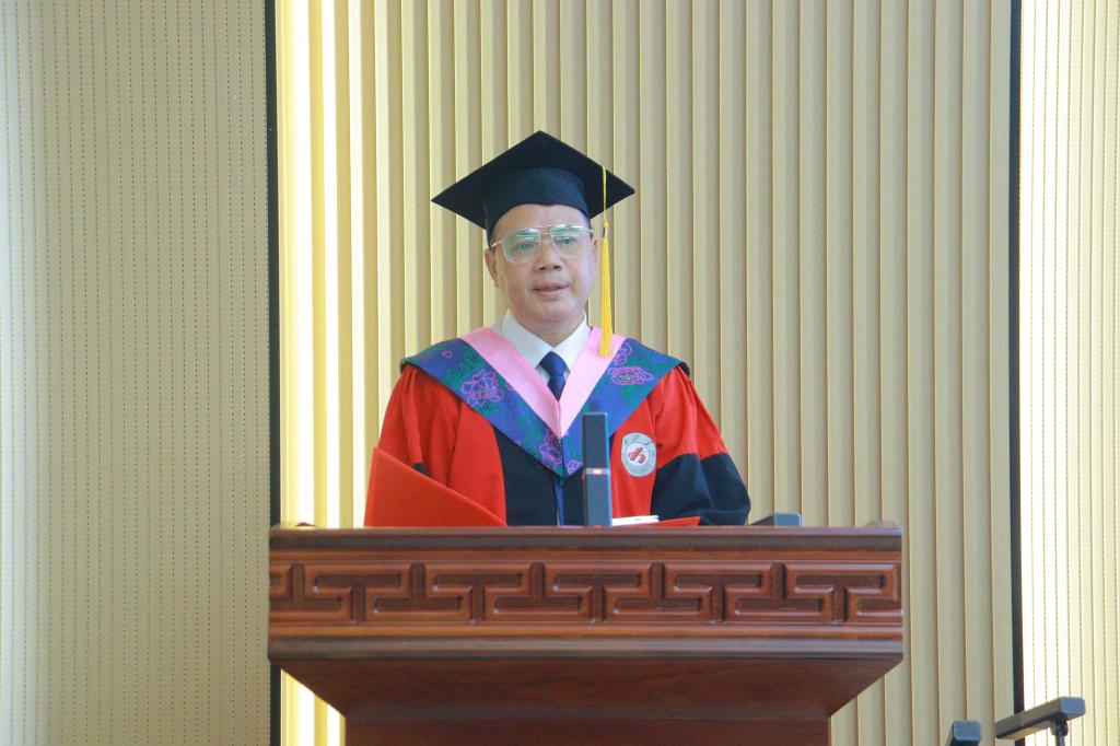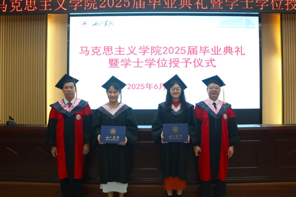 仪式在庄严激昂的国歌声中拉开帷幕。毕业生代表王迟深情致谢公司领导和老师的培养,回忆入学憧憬、成长点滴及公司发展,并表示将牢记使命开启新征程;在校生代表蓝秋棉表示,立志以师兄师姐为榜样成长为优秀思政人;毕业班班主任顾结龙回顾员工从青涩到成熟的蜕变过程,并期望马院学子铭记“知”与“行”,以奋斗照亮未来新征途。随后,江洪明代表全院师生向毕业生致以最热烈的祝贺,并语重心长地赠言毕业生:一是以“我命由我不由天”自信自立,以马克思主义实践向光明;二是以“敢叫天地沉大海” 的气概,勇毅前行;三是以“初心始终如一”的决心,做真理传播者。期盼同学们以马克思主义者之名,书写时代华章,前程似锦。