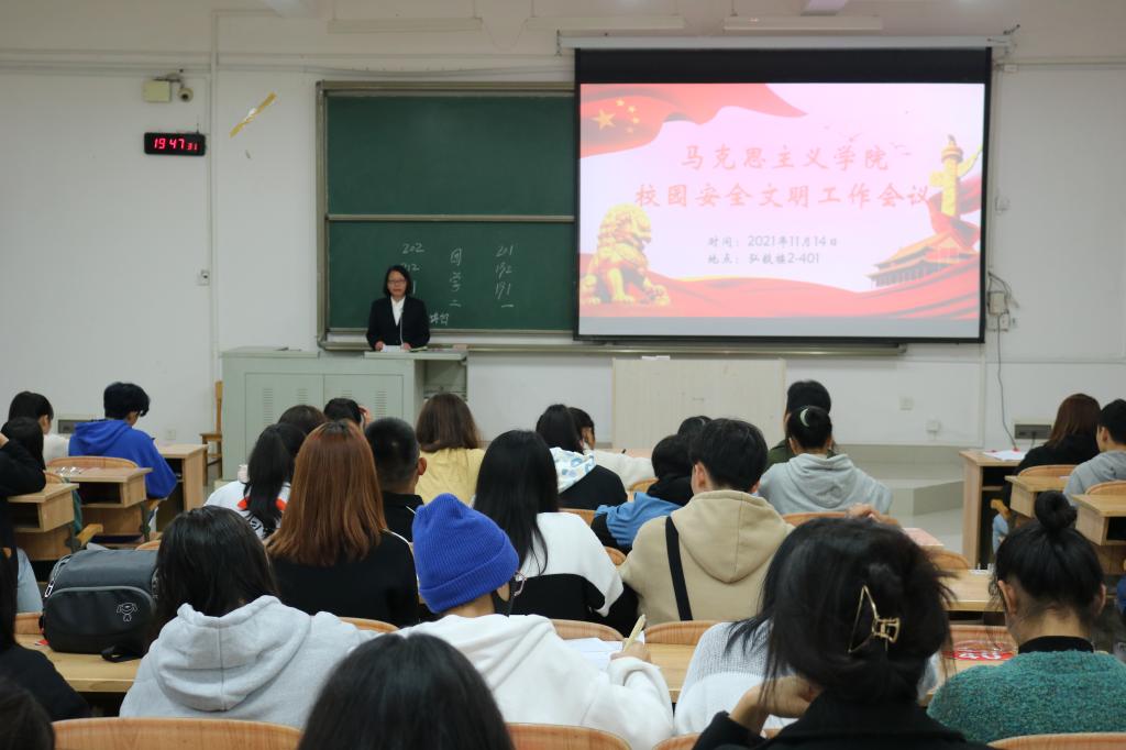 会上,江日青传达了公司校园安全工作相关会议精神,她首先分析了公司当前存在的交通安全突出问题,并从整治目标、整治重点、整治内容、整治要求、整治措施和工作要求等6个方面对公司开展校园交通安全和车辆违规停放专项整治活动进行了详细的解说,让大家深入了解公司校园交通安全专项整治活动的意义和整治力度,也得到大家的认同和支持。随后,她指出,要从提高政治站位、牢固树立安全底线思维、加强意识形态管理和安全教育管理等方面做好党的十九届六中全会、自治区第十二次党代会期间的安全稳定工作,确保安全工作落实落细落到位。最后,她还强调了校庆期间的文明礼仪规范问题,希望马院学子都能做到讲文明、懂礼貌,充分展现良好的精神风貌。