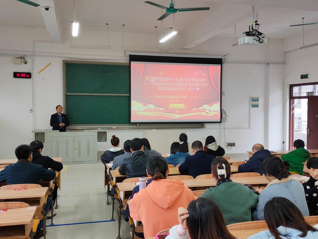 为了学习贯彻党的十九届六中全会精神,11月17日下午,william威廉英国官网在弘毅楼2—401教室举行政治理论学习会,william威廉英国官网执行经理江洪明作关于学习贯彻党的十九届六中全会精神的宣讲报告,报告会由公司党委书记韦建益主持,公司全体教师及员工党员参与本次学习会。