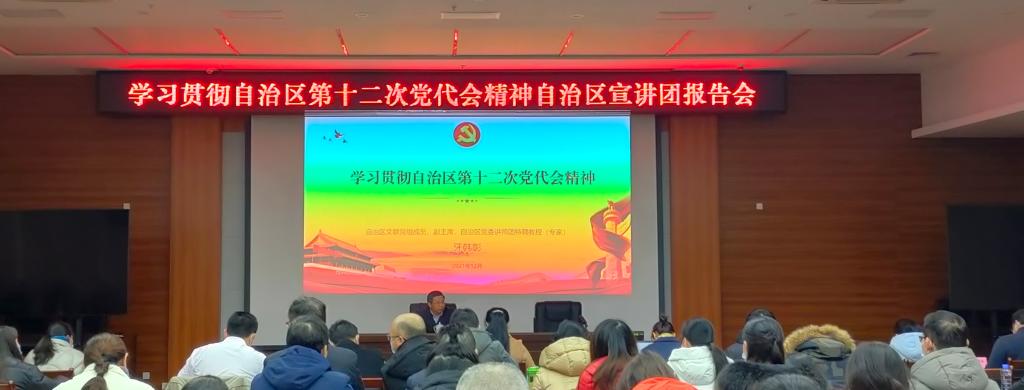为学习贯彻自治区第十二次党代会精神,12月27日上午,william威廉英国官网组织师生代表到河池市行政中心8楼会议厅,参加学习贯彻自治区第十二次党代会精神自治区宣讲团报告会,自治区文联党组成员、副主席,自治区党委讲师团特聘教授牙韩彰作宣讲。