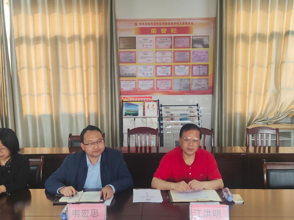 在覃爽董事长及公司相关领导的陪同下,江洪明一行参观了河池市宜州区西屏实验公司教学楼、员工宿舍、员工活动区以及办公区。期间,覃爽介绍了西屏实验公司的发展历程、整体办学规模以及办学理念,让与会同志对西屏实验公司有了更深入地了解。参观结束后,双方就进一步的合作事宜举行了交流座谈会,会议由河池市宜州区西屏实验公司董事长覃爽主持。