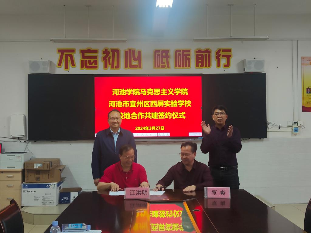 江洪明对西屏实验公司的热情接待表示了感谢,并指出西屏实验公司能在不到六年的时间内取得如今的成绩是可喜可贺的,关心、支持并深化与贵校合作是我们公司的重点工作之一,也是公司贯彻落实公司关于加强校地合作相关指示、深化大中小学思想政治教育一体化以及做好2024年思想政治教育专业认证的必然要求。江洪明强调,公司发展正值机遇期,在学术研究、人才结构、党建业务等方面具有诸多优势,与贵校存在许多合作发展的契机,希望可以持续交流,寻找更多的合作点以及合作方式,促进公司与贵校共同发展。韦宏思就本次合作的重点——2024年思想政治教育专业认证情况进行了具体介绍,双方就合作事宜进行了具体协商。座谈会后,为巩固合作成果,方便继续深化合作,双方举行了校地合作共建签约仪式。