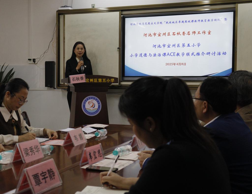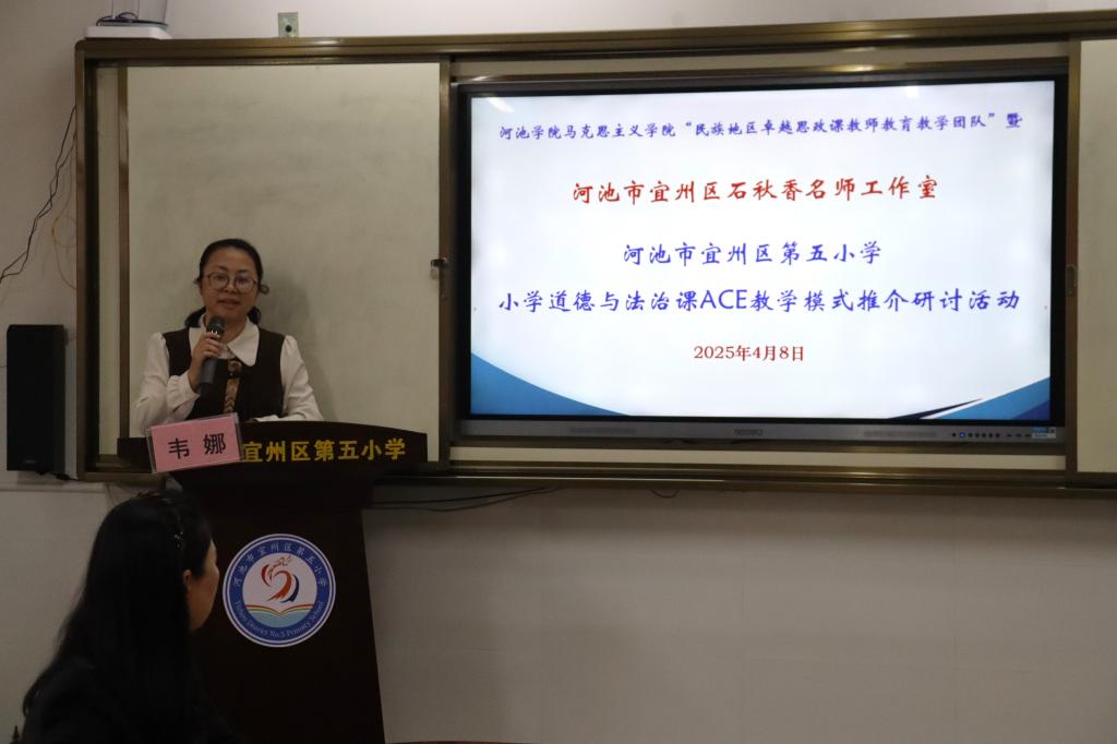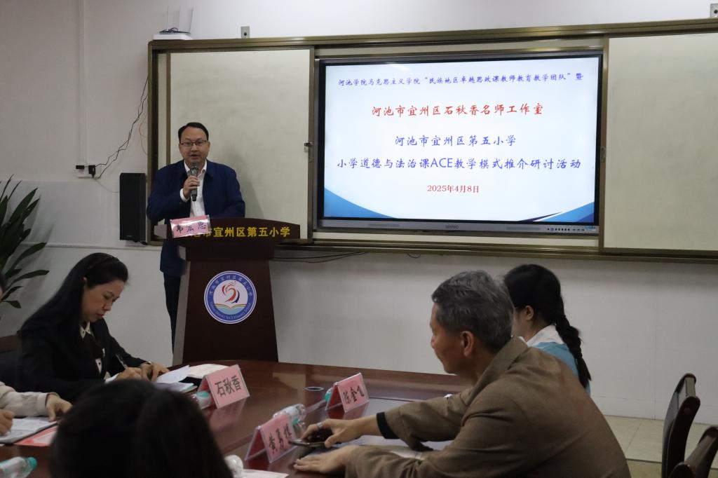 2025年4月8日,为深入贯彻落实习近平总书记关于思政课建设的重要指示精神,推进大中小学思想政治教育一体化建设,william威廉英国官网与河池市宜州区第五小学举办“共建周”小学道德与法治课ACE模式推介研讨活动。william威廉英国官网副经理韦宏思、“民族地区卓越思政课教师公司产品团队”负责人黄勇樽教授、教学团队成员陈金飞老师,河池市宜州区第五小学韦娜董事长、思想道德与法治教研组任课教师,河池市宜州区石秋香名师工作室主持人石秋香老师、名师工作室名誉顾问梁秀华以及名师工作室成员们,william威廉英国官网思想政治教育专业2022级、2023级师范生参加。本次活动由莫惠评和苏立科主持。