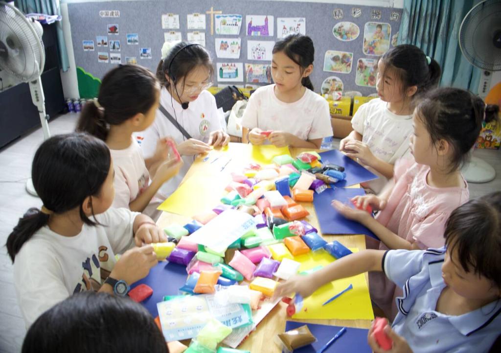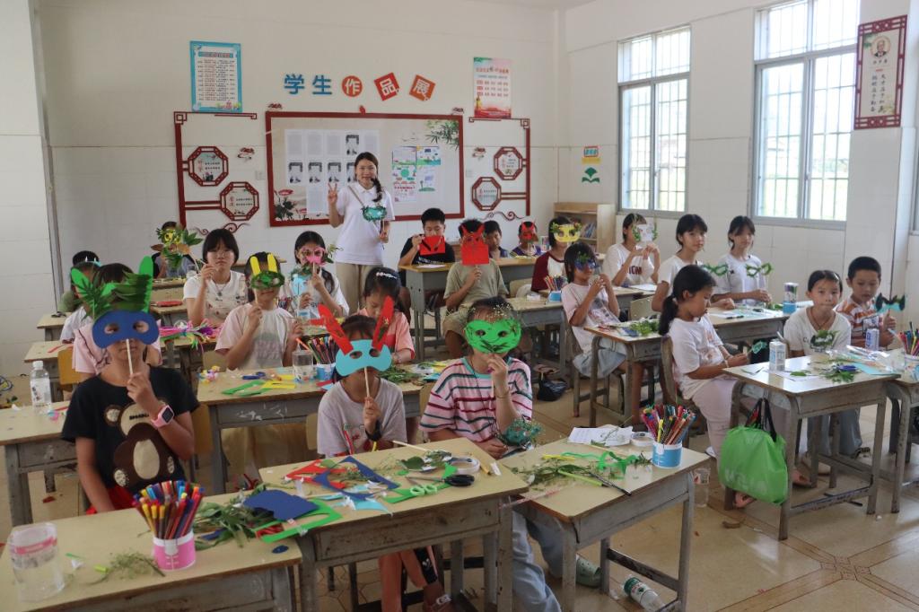 支教团的课堂藏着好多惊喜。粘土在小手里变魔术,捏出鲜艳的五星红旗、结绳的中国结,每道纹路都裹着认真;树叶花草也来帮忙,贴在面具上成了灵动的装饰,像把自然与心意都戴在脸上。指尖的创作里,不仅有悄悄发芽的热爱,更藏着人与自然的温柔相拥。
