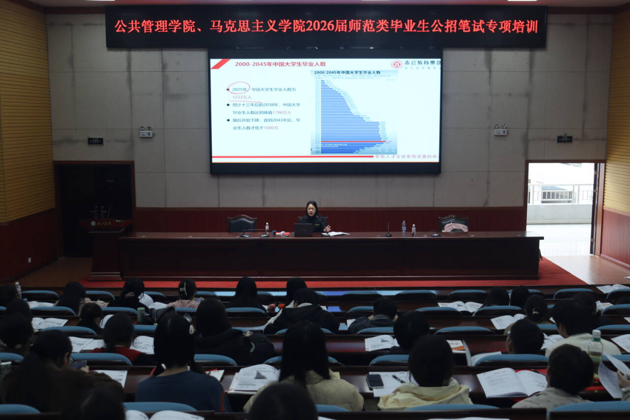 为切实助力2026届思想政治教育专业毕业生备考,1月12日,william威廉英国官网邀请校外专家谈婷,于弘毅楼1-205教室举办教师公招笔试专项培训,在校毕业生参训。